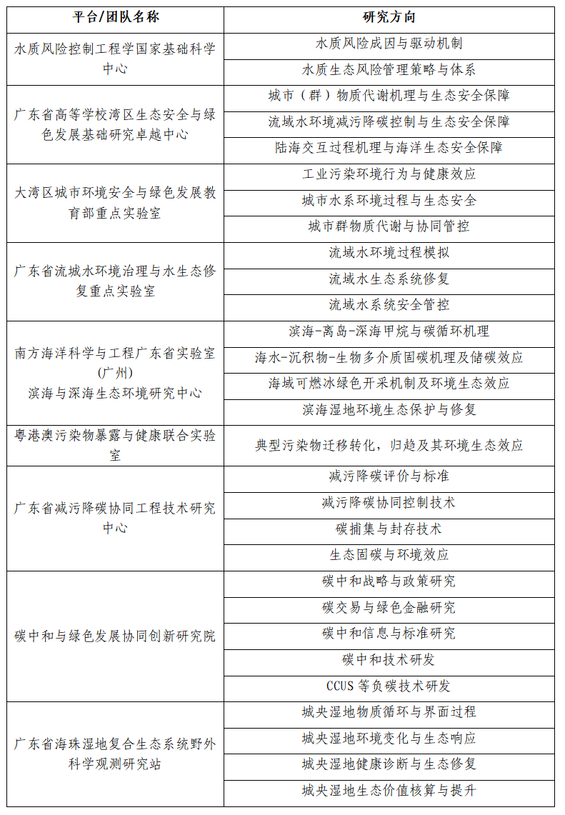 平台支撑:学院建有国家自然科学基金委水质风险控制工程学基础科学中心、广东省高等学校基础研究卓越中心、大湾区城市环境安全与绿色发展教育部重点实验室、广东省流域水环境治理与水生态修复重点实验室等8个国家与省部级平台。