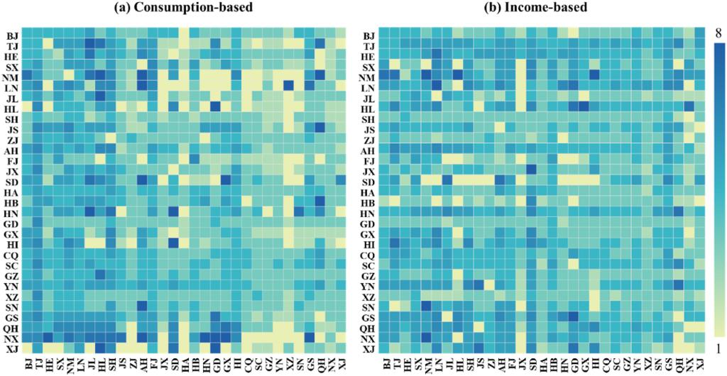 图3.2012 - 2017年需求与供给视角下跨区域对的解耦状态(热图a中的单元格显示了由行区域的最终需求驱动的列区域碳排放和增加值的解耦程度,热图b中的单元格显示了由列区域的初始投入引起的行区域碳排放和增加值的解耦程度)