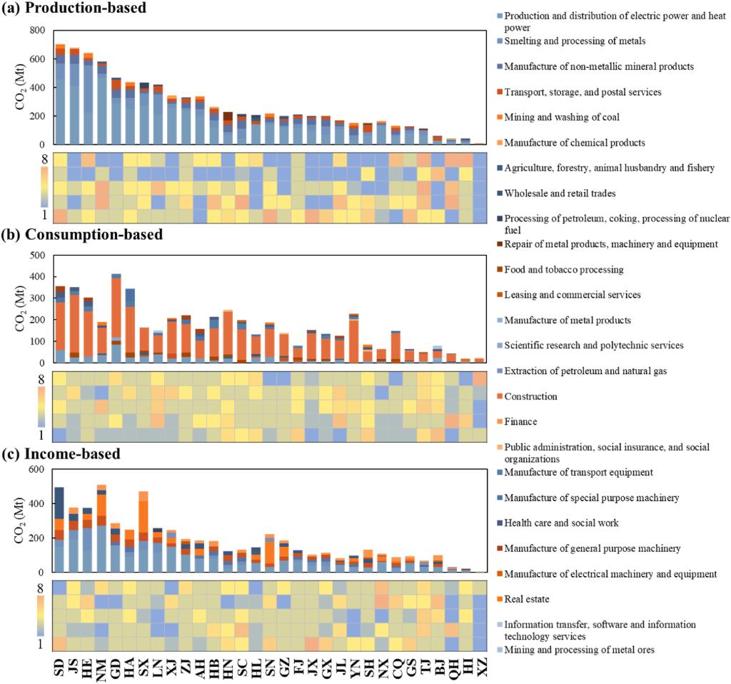 图2.2012 - 2017年中国各地区碳排放量排名前五行业在生产、需求和供给视角下的解耦情况(热图显示了从1到8的解耦程度)