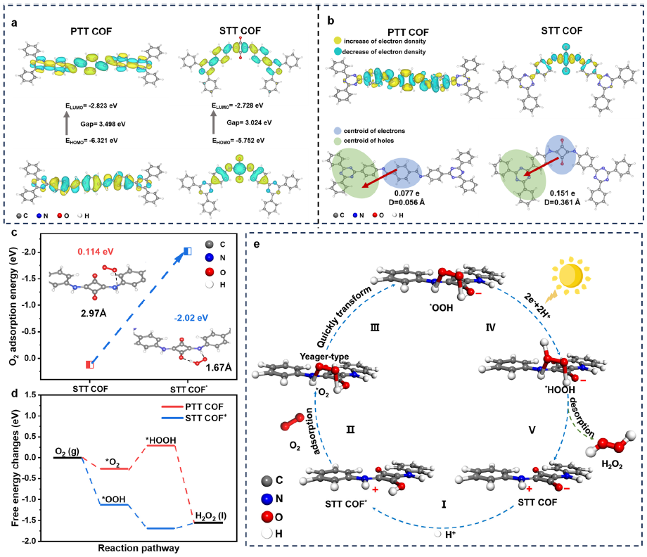 图5.图5. (a) PTT COF和STT COF的HOMO-LUMO分布计算结果。(b)上方:PTT COF和STT COF基态与激发态电荷密度差计算,下方:紫色和绿色代表电子和空穴的质心。(c) STT COF及STT COF*最优位点的O2吸附能。(d) PTT COF和STT COF*光催化氧还原产H2O2的自由能台阶图。(e) STT COF光催化生成H2O2的机制示意图。