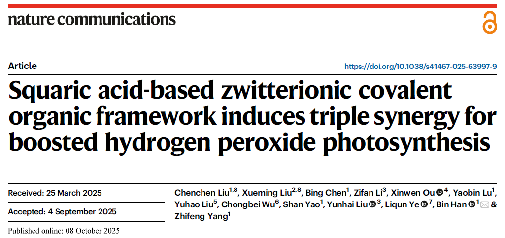 杨志峰院士团队韩彬教授课题组在Nature Communications上发表了题为“Squaric acid-based zwitterionic covalent organic framework induces triple synergy for boosted hydrogen peroxide photosynthesis”的研究论文。韩彬教授为论文通讯作者,弹珠台游戏