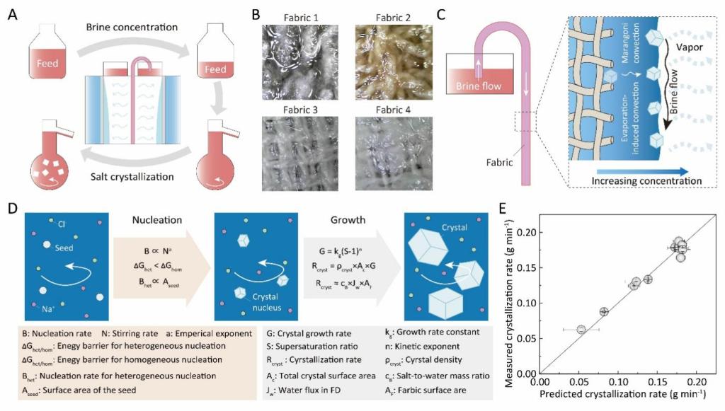 图2. FDC在盐水结晶中的工作机制。(A)FDC中蒸发和结晶的耦合过程。(B)FDC实验过程中盐水沿织物流动的照片。(C)FD抗结垢机理。(D)盐结晶动力学分析。(E)FDC实验中结晶速率的实际测量值与理论预测值对比。